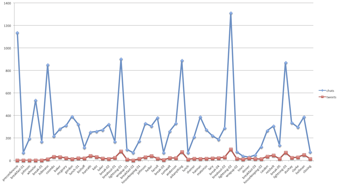 When talking about the backchannel, many people say, “It is too distracting; there is too much stuff there.” I then ask myself, “How much is too much?” Using the graph as evidence, I can see there are about 300 chats per event. Each event is about 20-30 minutes long. That averages out to 10ish chats per minute or 1 item every 6 seconds. I now have a yardstick. When the chat volume is equal to or greater than 1 item every 6 seconds, then there is too much stuff for many people to follow.