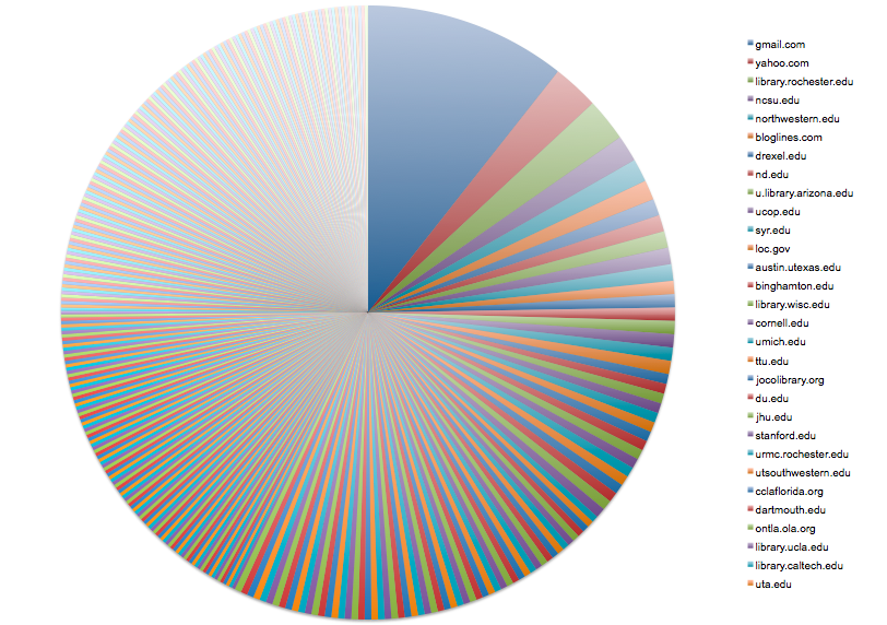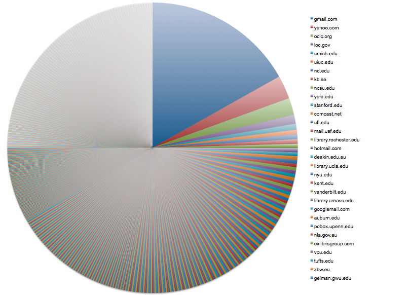 It is interesting to note how many of the subscribers seem to be located in Mountain View (California). This is because many people use Gmail for their mailing list subscriptions. The mailing lists I moderate/manage are heavily based in the United States, western Europe, and Australia — for the most part, English-speaking countries. There is a large contingent of Usability4Lib subscribers located in Rochester (New York). Gee, I wonder why. Even though the number of subscribers to Code4Lib and NGC4Lib is similar, the Code4Libbers use Gmail more. NGC4Lib seems to have the most international subscription base.