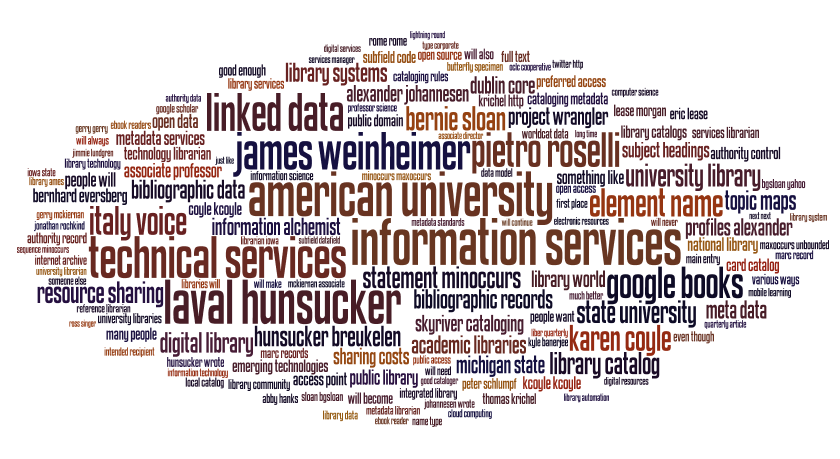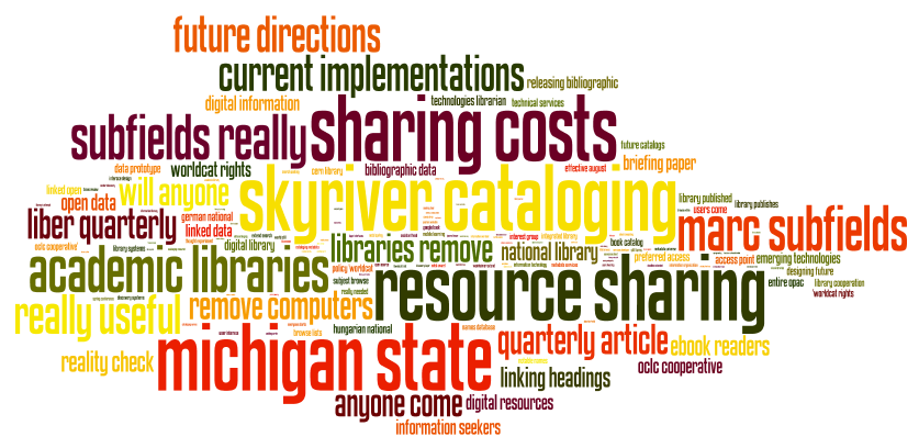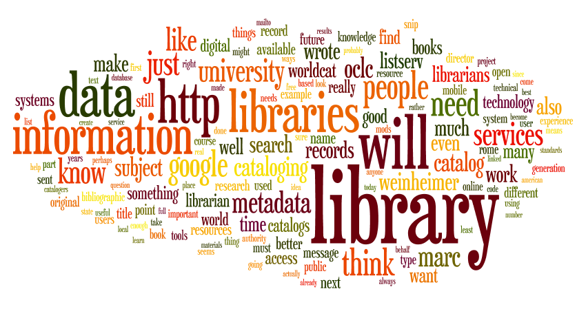 2. The discussion is too much focused, IMHO, on traditional library cataloging. There is so much more to the catalog than metadata. We need to be asking questions about what it contains, how that stuff is selected and how it gets in there, what the stuff is used for, and how all of this fits into the broader, worldwide information environment. We need to be discussing issues of collection and dissemination, not just organization. Put another way, I wish I had not used the word “catalog” in the name of the list because I think the word brings along too many connotations and preconceived ideas.