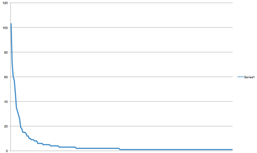 The lie chart illustrates the same point differently; a few people post a lot. We definitely have a long tail going on here.