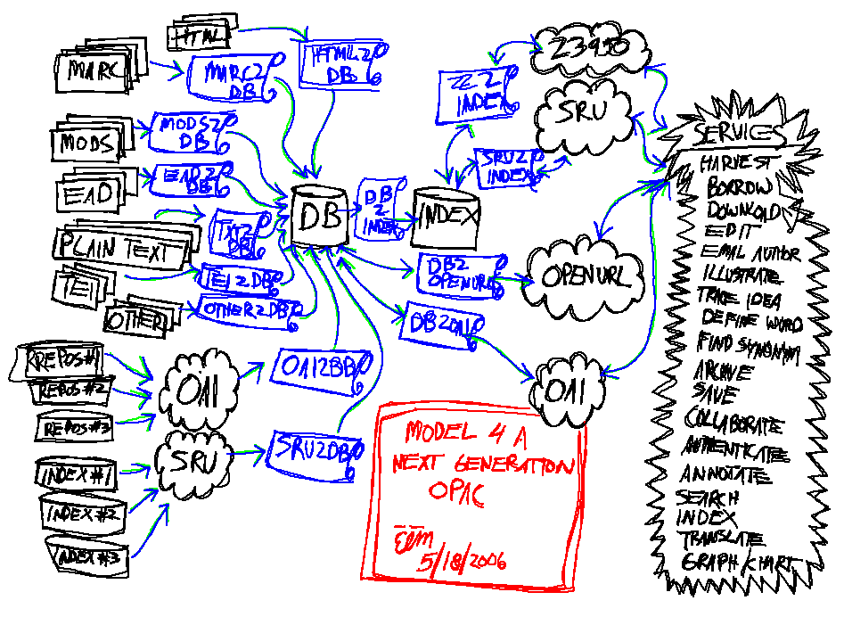 Technically speaking, this "next generation" library catalog is a database/index combination. The database is made up of XML files of various types: MODS, TEI, EAD, etc. The index is a full-text index supplemented with XML-specific elements as well as Dublin Core names. End-user access to the system will be through a number of searchable/browsable interfaces facilitated by SRW/U. Services against individual items from the interfaces (such as borrow, download, review, etc.) will be facilitated via OpenURL.