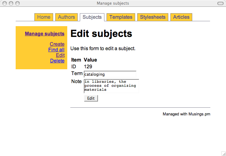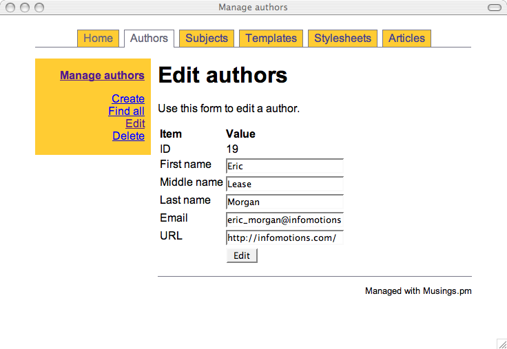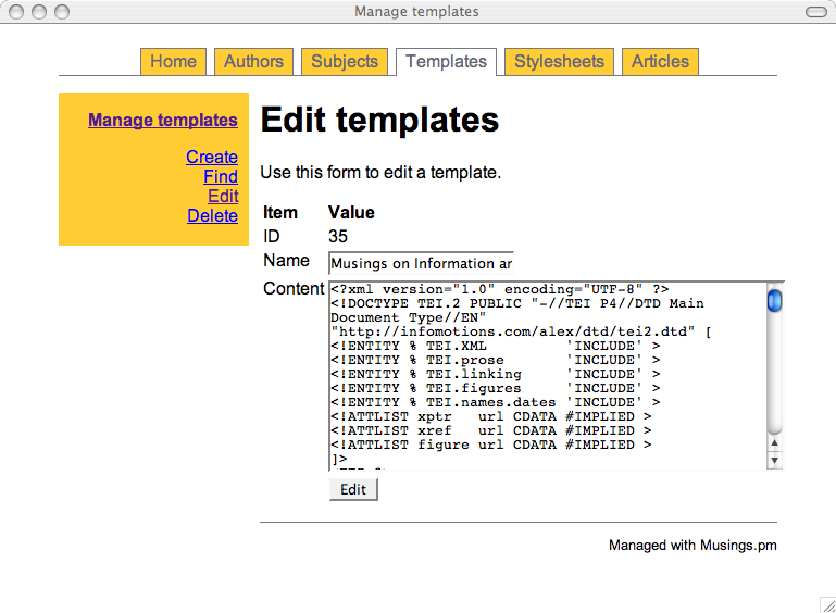 Once the modules were written I was able to write an administrative interface in the form of a set of CGI scripts. Like the modules, there is one CGI script for each of the tables in the database. For example, the authors.cgi script allows me to add, find, edit, and delete author information -- an authority file in library parlance. The subjects.cgi script allows me to manage a set of controlled vocabulary (subject) terms used to classify my articles. The templates.cgi facilitates the maintenance of TEI skeletons. These skeletons contain tokens like ##AUTHOR## and ##TITLE##, and these tokens are intended to be replaced by real values found in the other tables in order to create valid TEI output.
