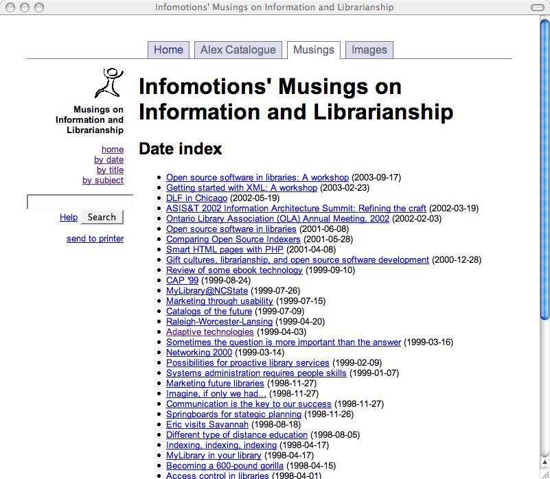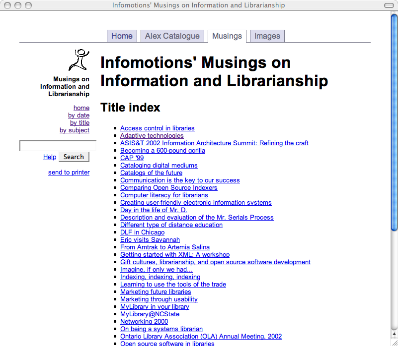 To make this happen I wrote one more CGI script, the system's home page . This page includes an introduction to the collection, a search box, and a list of three links to title, date, and subject indexes. These indexes are created dynamically taking advantage of Musings.pm. If I got fancy, I could count the number of times individual articles where read and provide a list of articles ranked by popularity. Similarly, I could watch for types of searches sent to the system and create lists of "hot topics" as well.