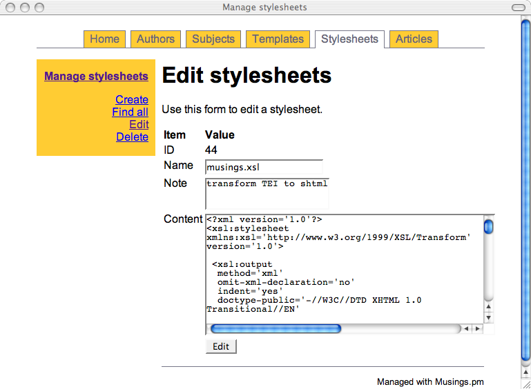 It is important to note the administrative interface is more of a publishing system and is in no way an editor. Each of the parts of the system (authors, subjects, templates, stylesheets, articles) are expected to include XML mark-up. It is up to me to mark-up the content before it gets put into the system. To accomplish this, I use a text editor (BBEdit) on my desktop machine, and BBEdit allows me to create a "glossary" or set of macros to mark-up the documents easily. The administrative interface simply glues the parts of the system together and saves the result accordingly.